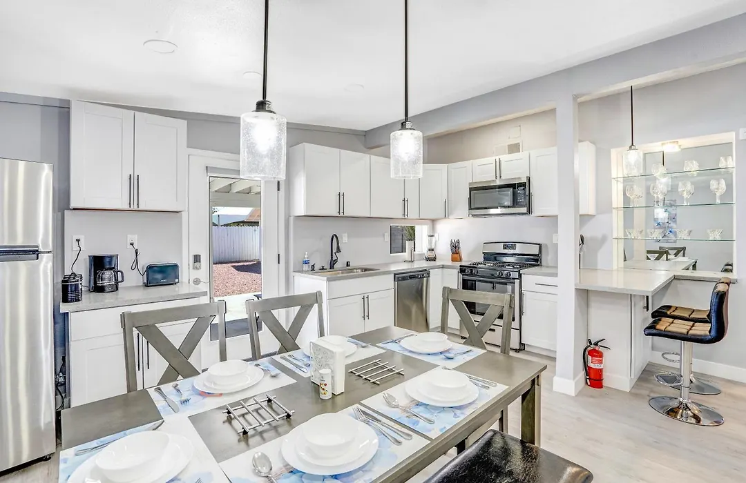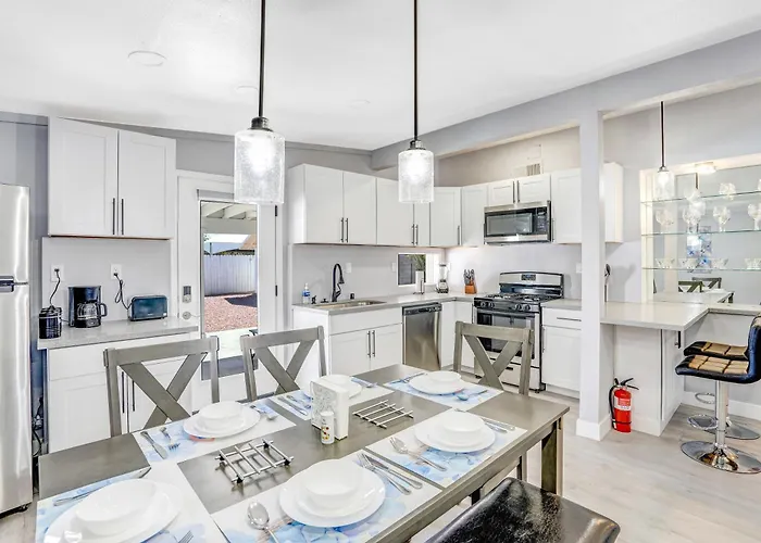 Fully Remodeled, Landscaped, King Beds, Desk Space villa features an equipped kitchen fitted with coffee and tea making equipment, a refrigerator, and a stove top. The restaurant Roberto's Taco Shop is located a 12-minute walk away and serves Mexican dishes.